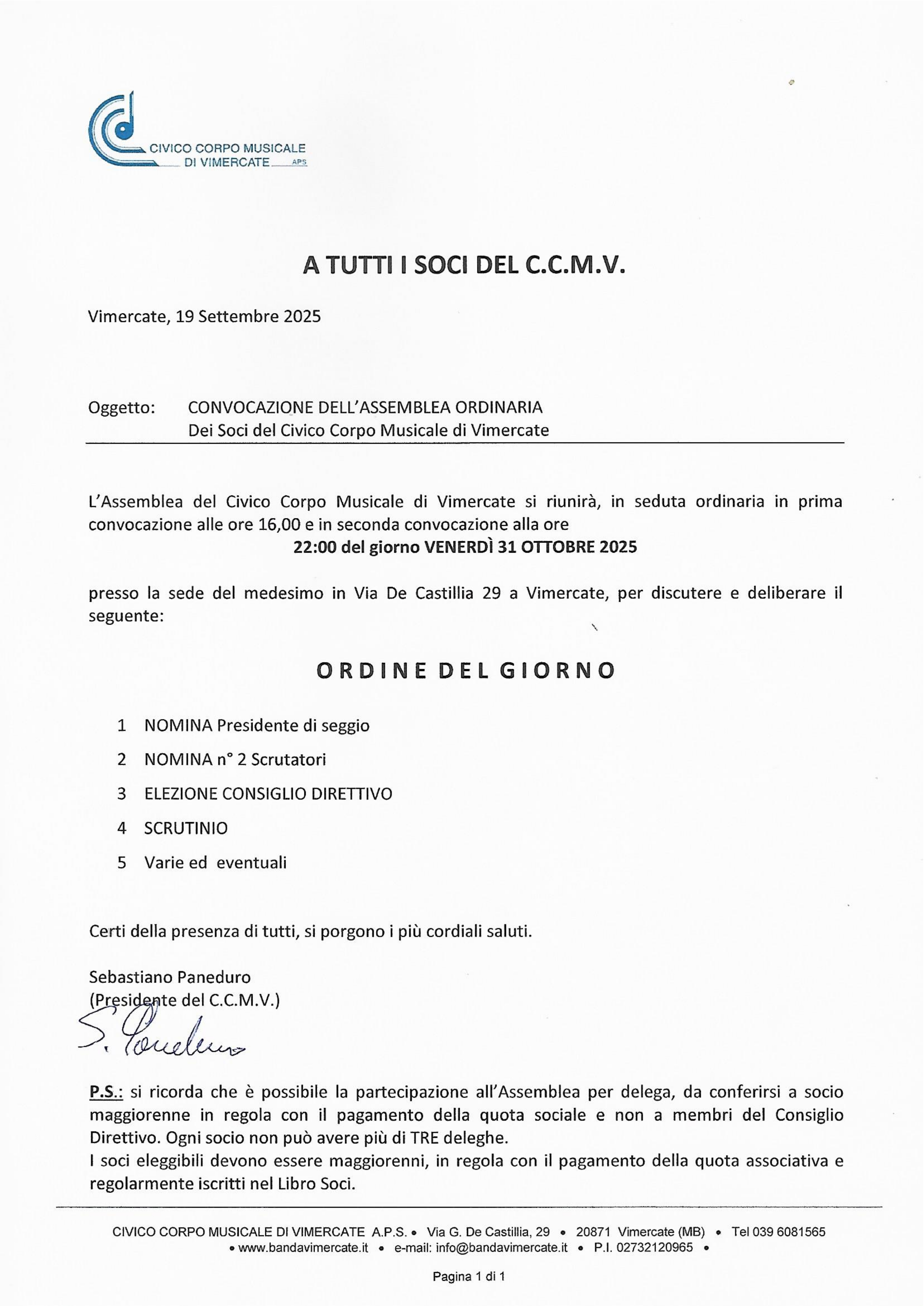 Venerdì 31 ottobre 2025, si terrà l'Assemblea ordinaria dei Soci del Civico Corpo Musicale di Vimercate per l'elezione dei consiglieri per il prossimo quadriennio 2025-2029.