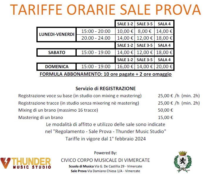 A marzo 2015 il Civico Corpo Musicale di Vimercate (CCMV) ha ricevuto l'incarico della gestione delle Sale Prova comunali, oggi chiamate Thunder Music Studio, dove gli appassionati di musica e canto possono suonare e cantare da soli o in compagnia.
